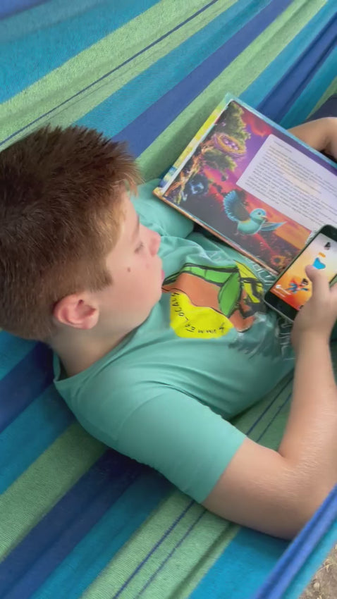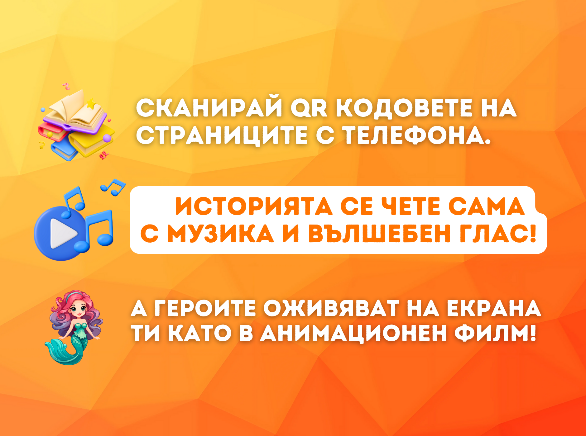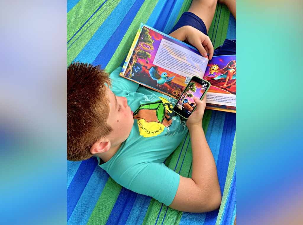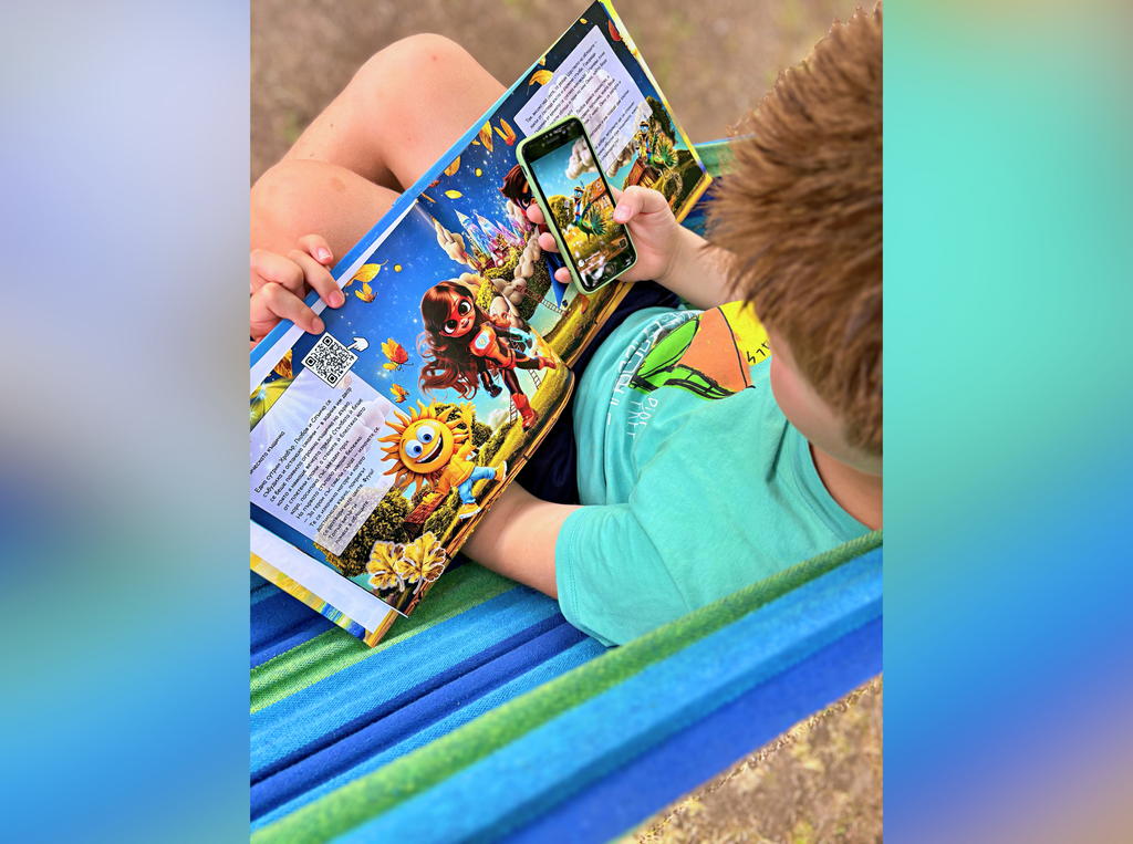 Представете си, че държите в ръцете си една книга, която оживява! Просто сканирате кода с телефона си и на екрана се поява разказвач с приятен, топъл глас, който започва да чете историята, сякаш ви я разказва на живо. Докато слушате, на екрана се появяват интерактивни стрелки, които ви насочват да посочите различни герои в книгата. Когато го направите, те оживяват, появяват се нови сцени, подводни светове или героите започват да танцуват и така всяка история се превръща в едно интерактивно приключение, което увлича децата и ги прави част от самата приказка.